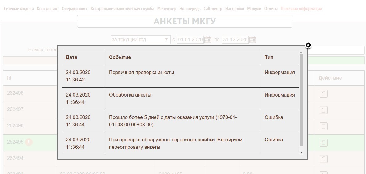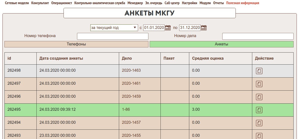 С помощью этой формы можно промотреть анкеты и факты обращений созданные в системе за период, у казанный в фильтре. Также можно найти анкету по номеру дела или номеру телефона. Оценки и факты обращений разделены по цветам, в пенели фильтров можно включить показ только оценок или только фактов обращений. Также имеется возможность просмотреть логи отправки каждого факта в отдельности.