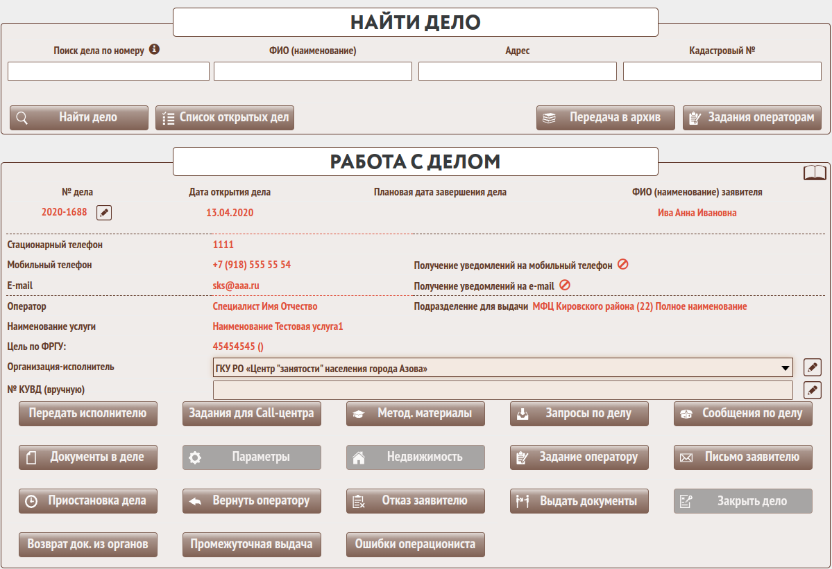 Из предложенного списка специалист КАС выбирает нужное дело. При этом откроется форма работы с делом.