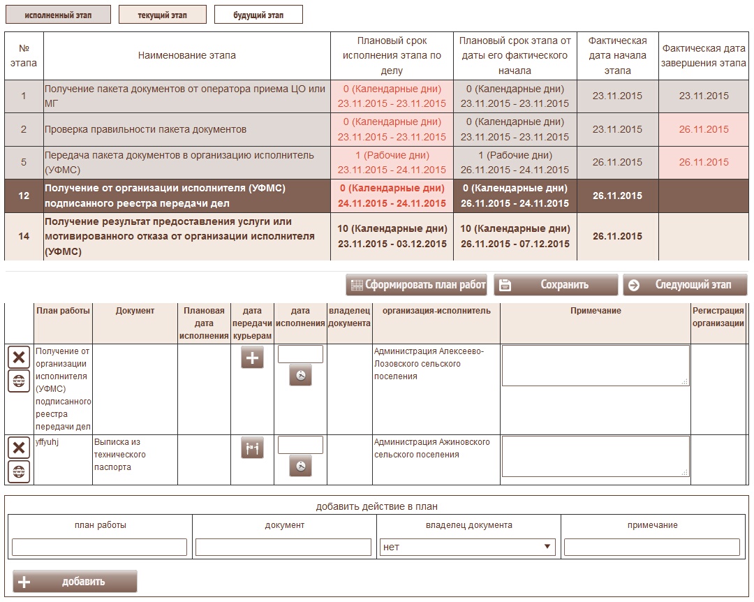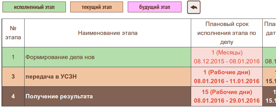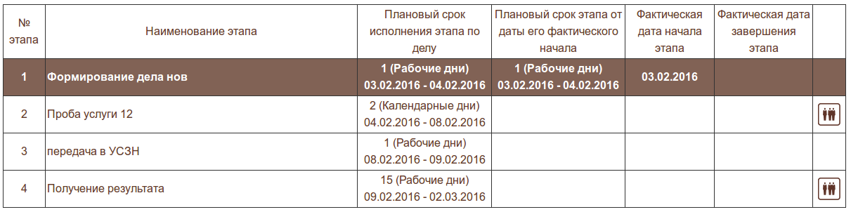 Здесь представлены этапы прохождения дела с плановой датой завершения этапа, сформированные в момент передачи дела от операциониста, в соответствии с жизненной ситуацией Заявителя.