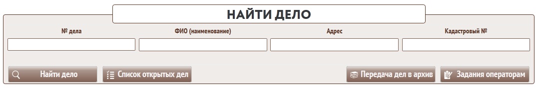 Сотрудник КАС может выбрать дело по номеру, поискать по ФИО заявителя, поискать дело по кадастровому номеру для земельно-имущественных услуг,может открыть список всех дел, либо только те,которые находятся в работе, либо только приостановленные.