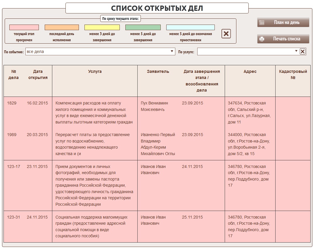 в котором видно состояние дела в соответствии с легендой. Можно включить фильтр по легенде.