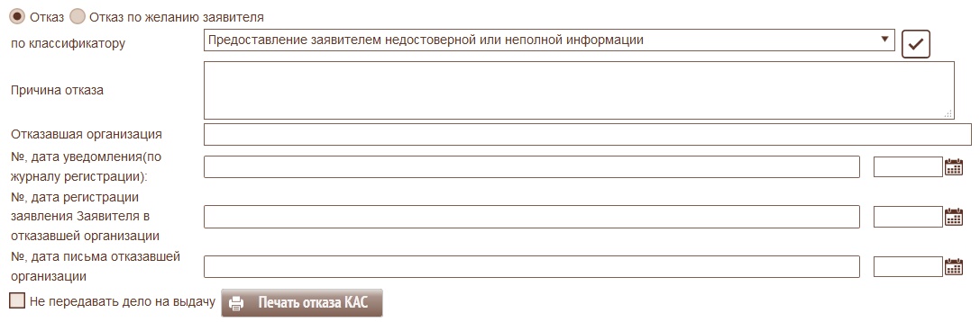 Специалист КАС может сформировать отказ, с указанием причины и документа-основания. Причина по классификатору необходима для статистических отчетов.