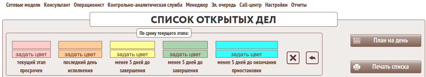 В зависимости от соотношения текущей даты и плановой даты, этапы подсвечиваются согласно легенде.