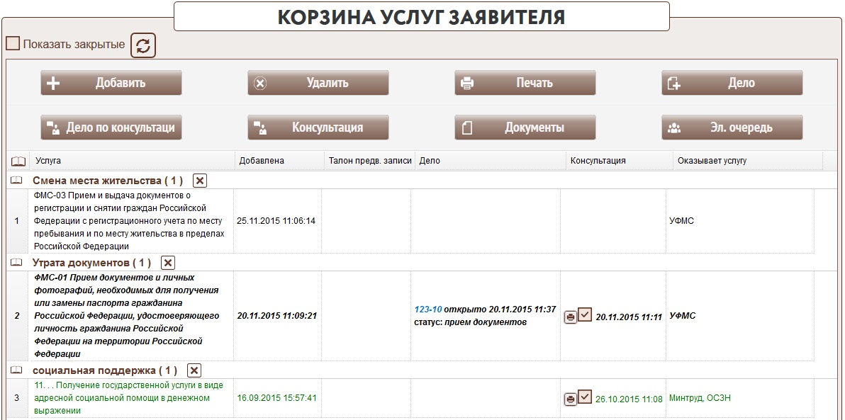 Корзина услуг заявителя предназначена для накопления и удобного хранения списка услуг, которые он желает получить. Доступ к корзине имеет заявитель из личного кабинета и операционист.