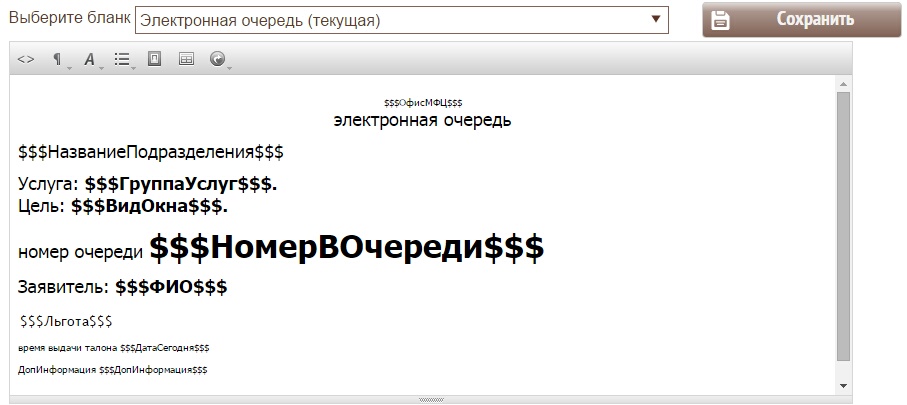 Позволяет отредактировать шаблоны для печати талонов на предварительную и текущую очередь, а также список документов при консультации.