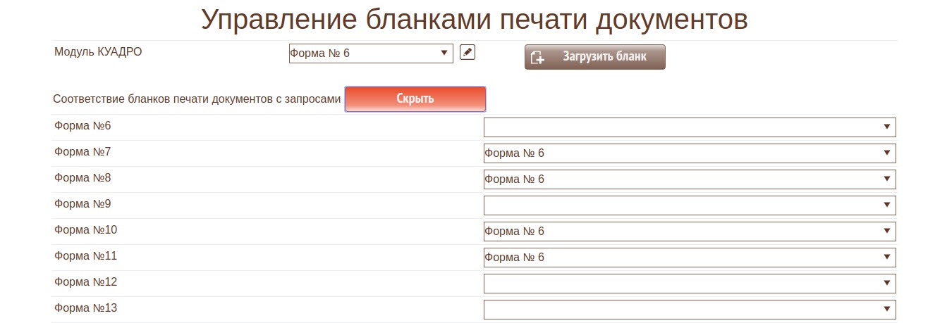 Настроить бланки для печати заявлений и их соответствие формам запросов. Для этого используется форма Настройки-->Модуль КУАДРО-->Настройки печати