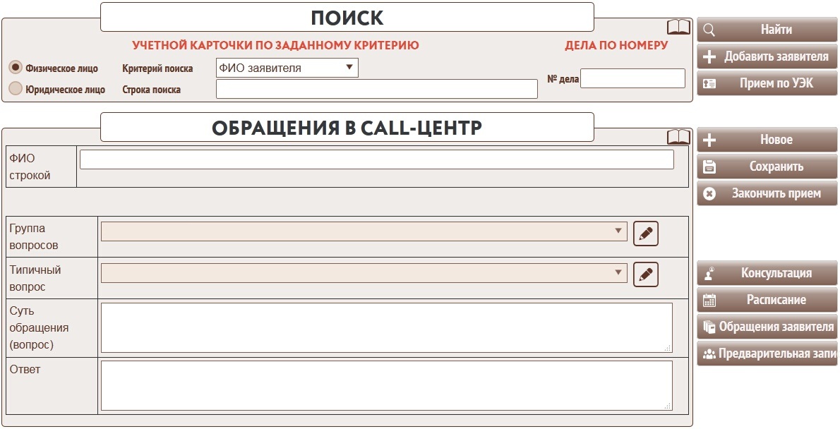 и в поле ФИО строкой ввести ФИО заявителя и продолжить консультацию заявителя. При нажатии на кнопку Новое становится активным поля "Группа вопросов", "Типичный вопрос".
