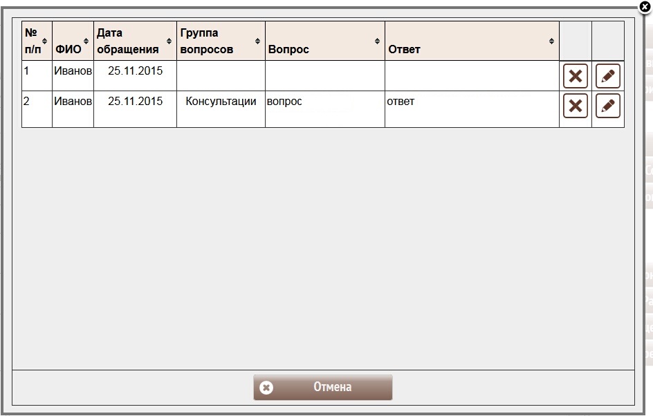 позволяет просмотреть, удалить или вызвать для редактирования предыдущие записи обращений за определенный период.