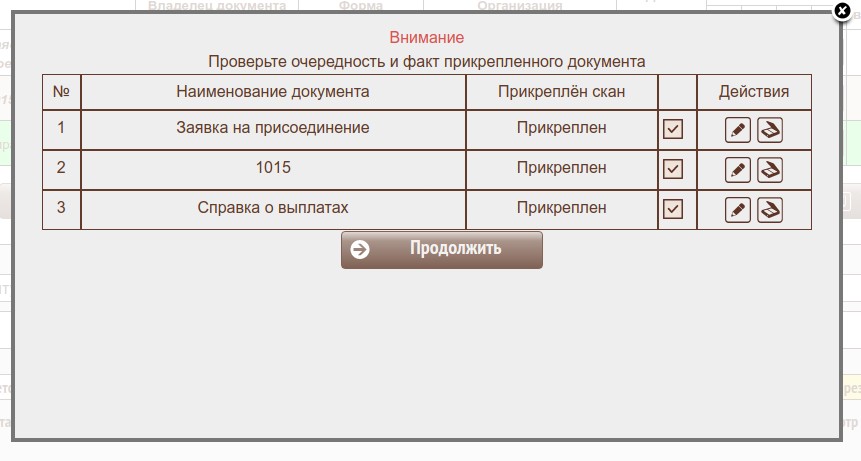При отправке запроса по алгоритму 214 появилась возможность указать последовательность документов при включении в архив. При отправка запроса открывается всплывающее окно со списком документов и элементами управления. Последовательность можно выставить перемещаяя строки списка с помощью мыши. Также можно запретить включение документа в архив - для этого нужно снять соответствующую документу "галочку" в списке. В форме есть возможность быстрого перехода в форму описению документа, а также можно просмотреть и скачать прикрепленные к документу вложения и сканированные образы. После установки необходимой последовательности документов нужно нажать кнопку "Продолжить", после чего запустится процесс создания архива запроса. В архив будет добавлен Титульный лист в pdf формате.