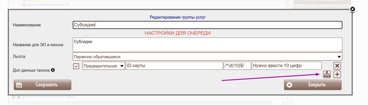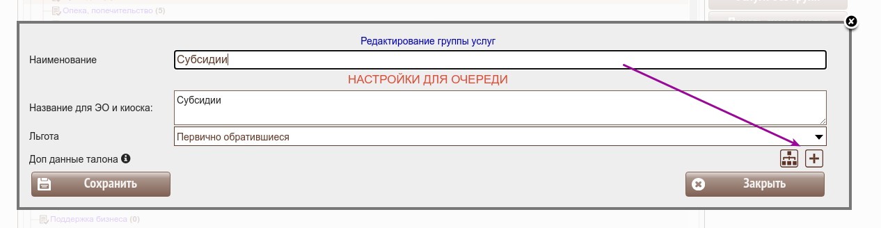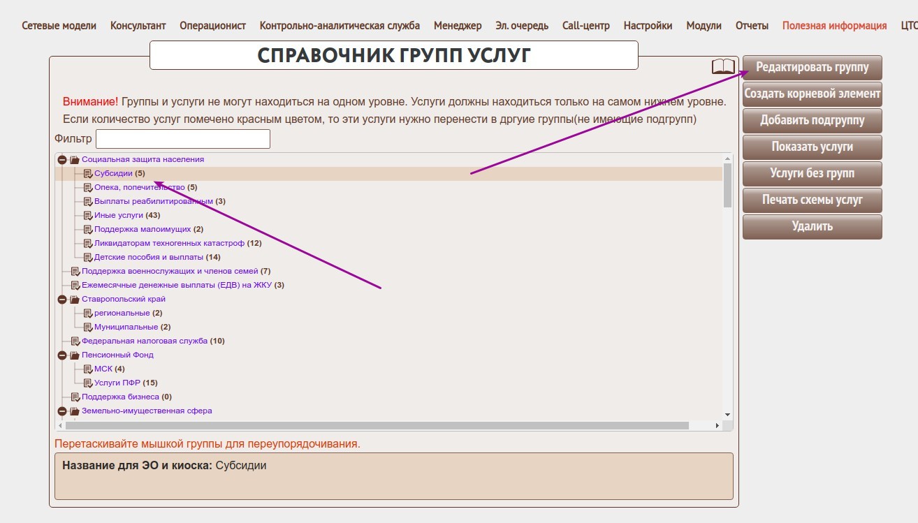 В системе электронной очереди (ЭО) существует возможность настроить такие дополнительные поля для разных групп услуг. Для настройки нового дополнительного поля для талона ЭО нужно перейти в справочник групп услуг - меню Сетевые модели -> Услуги -> Справочник групп услуг. Выбрать нужную группу услуг и в правом блоке с кнопками нажать "Редактировать".