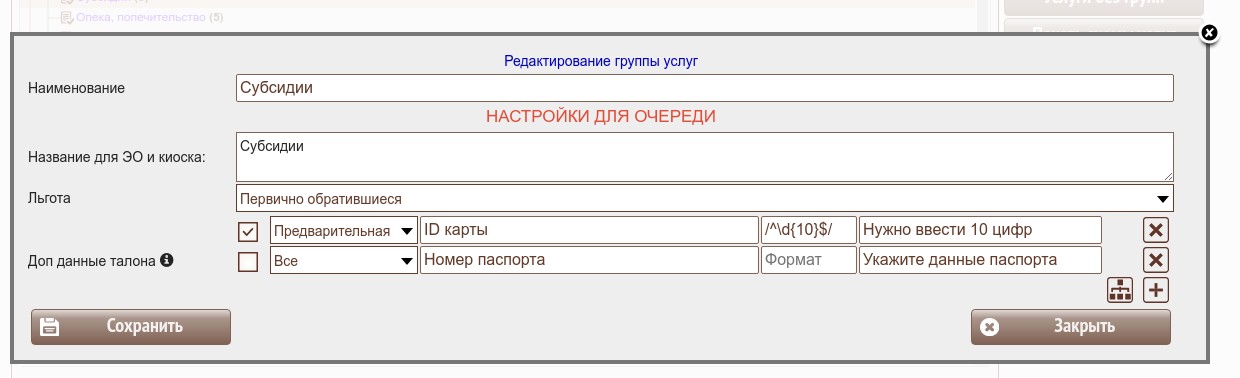 Настройки такие: - Обязательность ввода, если включено, то без заполнения будет отказано в печати талона. Если выключено, то ввод поля предлагается, но проверки на пустоту и соответствие шаблону не производятся - Тип очереди на который действует требования доп поля - текущая, предварительная, все - Название данных - Пример: «Введите идентификационный номер», эта величина может быть впечатана в талон и отображается в панели оператора при приеме талона по очереди - Формат - Маска для обозначения формата вводимых данных. В качестве формата нужно указывать регулярное выражение в стиле PCRE. Пример: /^\d{5}$/ - означает 5 цифр - Сообщение для пользователя чтоб было понятно в каком виде данные нужно вводить. Пример: «Номер должен состоять из пяти цифр»