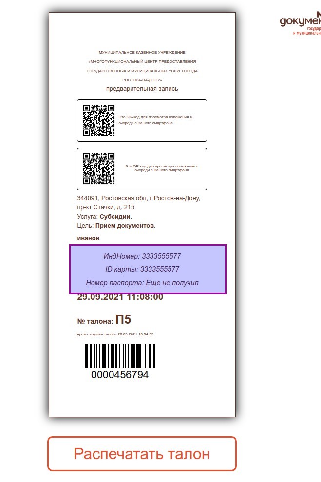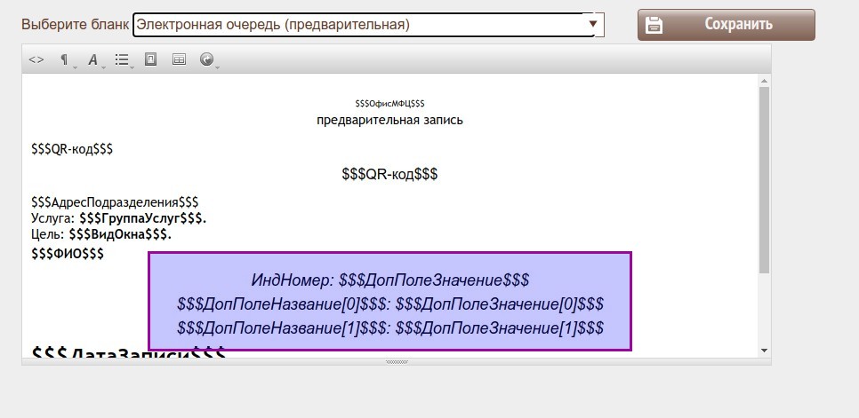 При печати талона очереди можно настроить печать дополнительных данных на талоне.