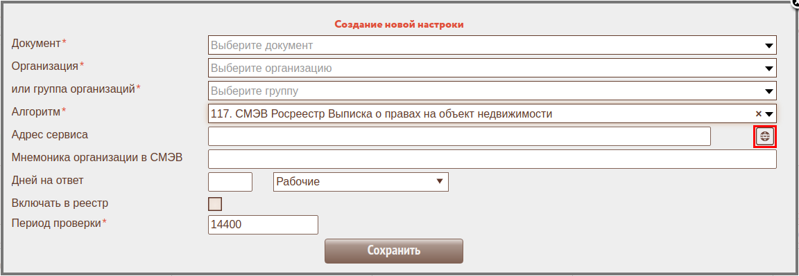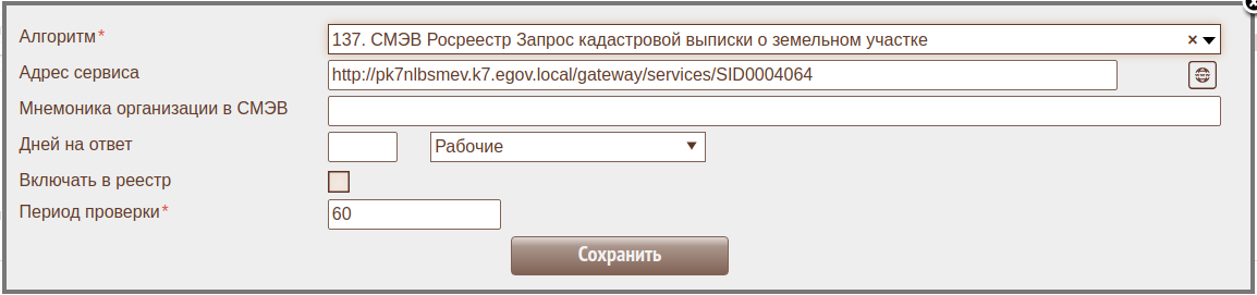 Организация выбирается из списка. Адрес запроса заполняется только при условии, что обмен будет происходить через прямую передачу параметров удаленному серверу организации или для СМЭВ2. Для алгоритмов СМЭВ3 адрес не вводится.
