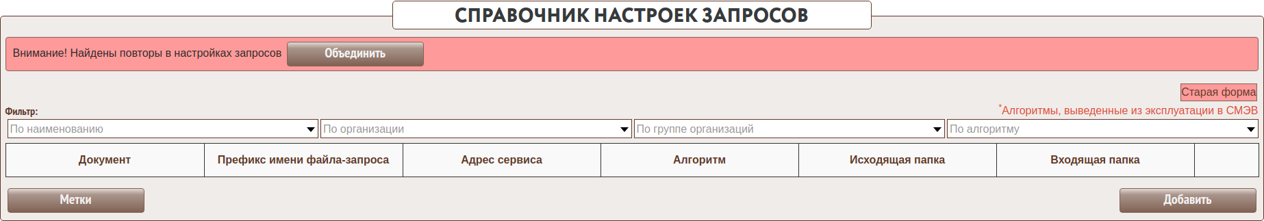 В случае, если в настройках обнаружены повторы (это возможно, например, при загрузке из репозитория), то необходимо произвести объединение дублирующихся записей кнопкой "Объединить"