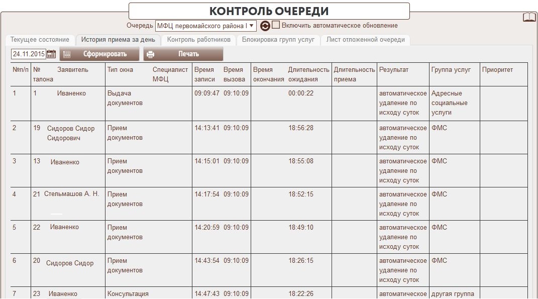«История приема за день» показывает всех прошедших через очередь граждан. Можно сформировать за любую выбранную дату (по умолчанию сегодня). И вывести эту таблицу на печать.