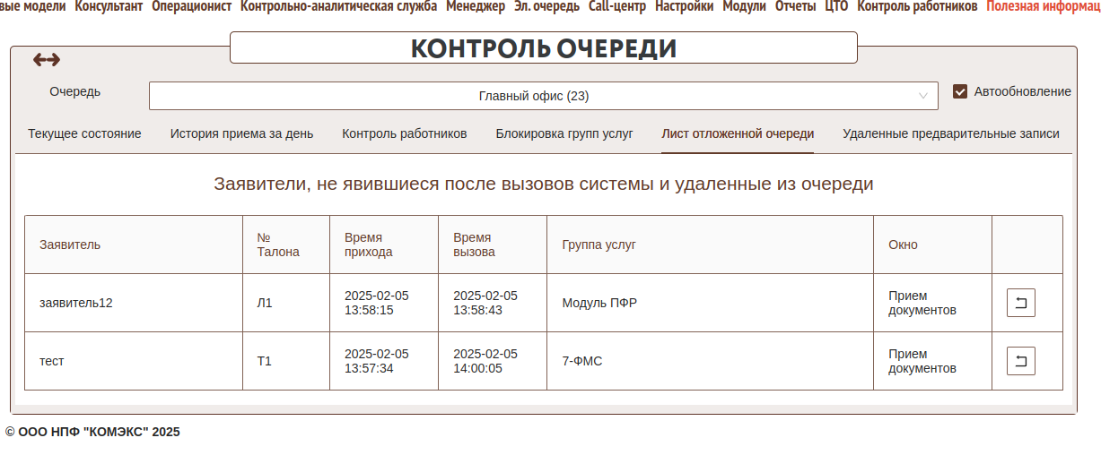 позволяет увидеть список талонов заявителей, которые не явились на прием и были удалены из очереди после нескольких вызовов. Администратор ЭО может восстановить их в очереди. Номер талон с которым восстанавливается талон будет дробным т.е. если восстанавливать талон Т1, то восстановленный получится с номером Т1-1 Если же восстанавливать уже дроюный талон, то дробная часть будет увеличиваться т.е. при востановлении талона Т1-1 восстановленный будет уже иметь номер Т1-2. При восстановлении программа спросит какое время считать моментом начала ожидания для восстановленного талона - момент нажатия на кнопку "восстановить" или момент получения первичного талона. При этом можно ограничить как долго талон может находиться в списке на восстановление и соответственно восстановлен. Для этого существует настройка в форме настроек очереди "Максимальное время для восстановления отложенного талона, мин"