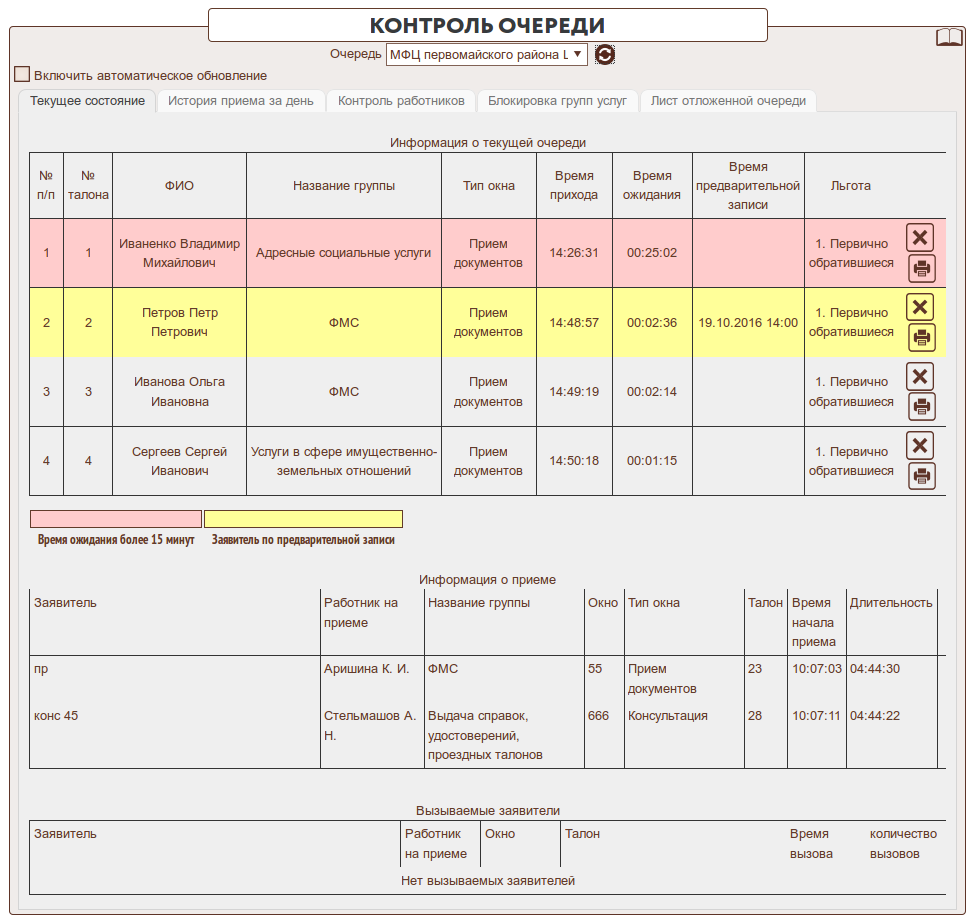 В разделе «Текущее состояние» показана информация о текущей очереди и информация о приеме.