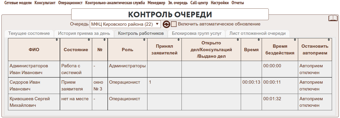 «Контроль работников» показывает текущее состояние специалистов МФЦ.