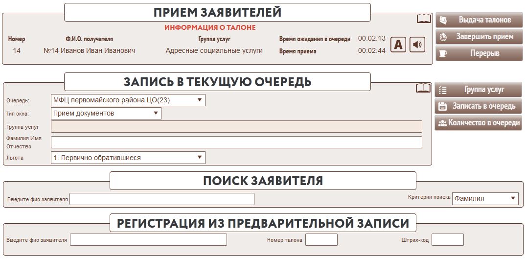 Если заявитель был предварительно записан на прием, он имеет приоритет. Для записи их в очередь нужно в форме "Регистрация заявителя по предварительной записи" найти заявителя.