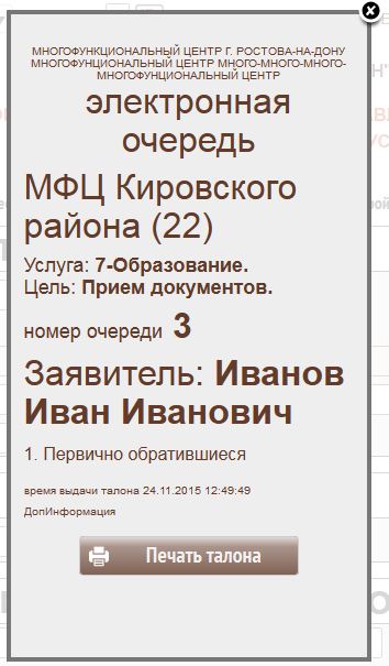 После записи будет распечатан талон, который отдается заявителю. Внешний вид талона определяется шаблоном, который может редактироваться администратором.