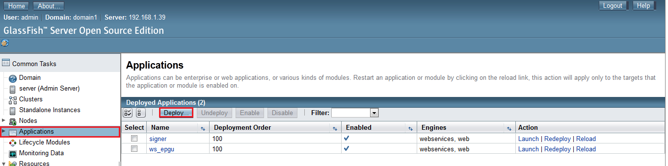 Выбрать пункт меню Applications и нажать кнопку Deploy. После этого необходимо выбрать программу для подписи. Она находится на сервере электронного документаоборота mfc-eldoc/dist