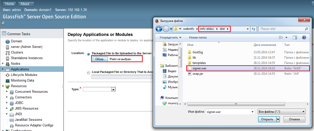Для дальнейшей настройки необходимо указать логин и пароль для подписи по адресу c:/glassfish4/