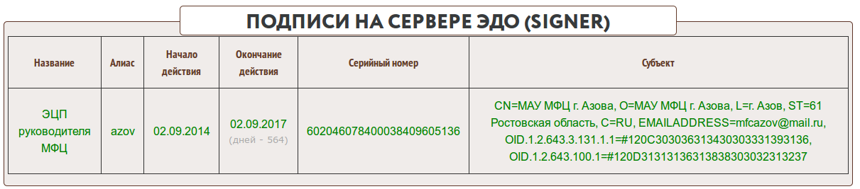 После настройки информационного файла системный администратор сможет увидеть информацию об этих подписях в "Настройках электронного документооборота". На ней можно получить информацию о сроке действия ЭЦП, серийном номере и субъекте.