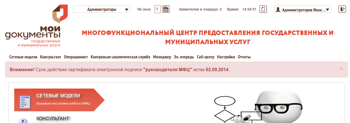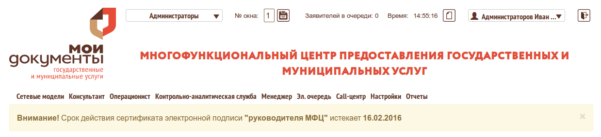 Когда заканчивается срок действия ЭЦП будет выведено информационное сообщение для Администратора МФЦ. Уведомление будет выведено за 30 дней до окончания срока действия подписей. Информационное сообщение будет выводиться каждый день.