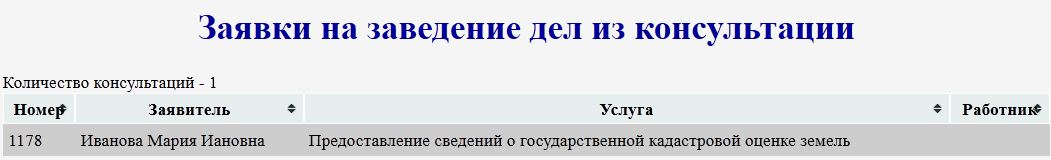 в которой операционист выбирает заявку на обработку и переходит к результату консультации заявителя.
