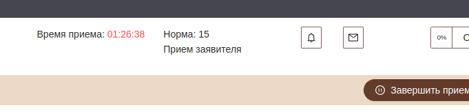 Когда заявитель направлен к специалисту, то в панели управления очередью специалиста отображается № талона, ФИО заявителя, группа услуг. Одновременно на табло отображается № талона и № окна, куда вызван заявитель. Произносится фраза «Посетитель номер … окно …». Для воспроизведения «окно» у специалиста могут быть настроены разные фразы — т. е. используются разные звуковые файлы, например фраза может звучать «Посетитель номер … консультант…» и «Посетитель номер … операционист…» (файлы okno_konsultant.mp3 и okno.mp3 в папке sound - в поставке содержат одну и ту же фразу «окно»). Количество повторов вызова заявителя и паузу между повторами настраивает специалист МФЦ - администратор ИС. В случае если после вызовов заявитель не явился, специалисту выдается сообщение «Заявитель номер талона заявителя удален из очереди». Если заявитель подошел к специалисту, тот нажимает кнопку «Начать прием» и начинает работу (система фиксирует время начала работы с заявителем). По окончании работы с заявителем нажимается кнопка «Завершить прием». Производится запись времени окончания обслуживания в статистику. Если специалист готов к приёму следующего заявителя, нажимается кнопка «Следующий» и цикл повторяется. Если в режиме ожидания (нажата кнопка «Следующий», заявителей нет) специалист должен отлучится, он может воспользоваться функцией перерыва либо нажать "Отмена ожидания заявителя".