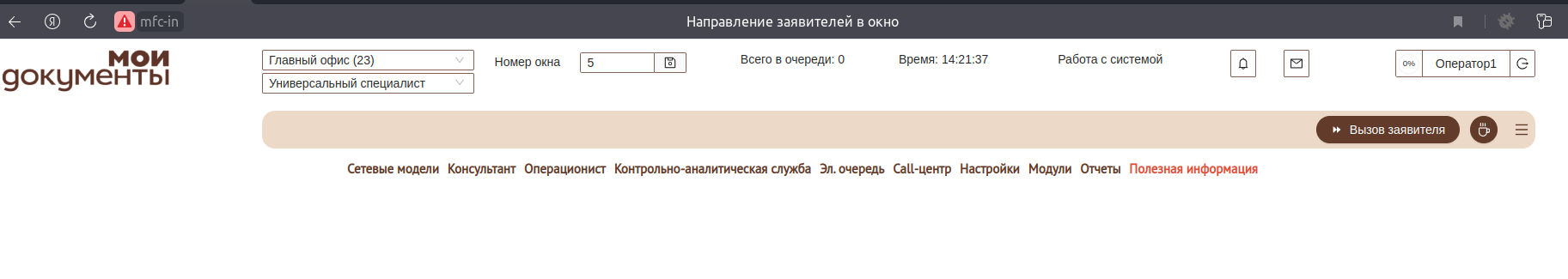 запись заявителя осуществляется на группу услуг к консультанту или операционисту (далее — специалист). При необходимости может быть введен 3-й вариант — операционист на выдаче, если МФЦ имеет ВЫДЕЛЕННОЕ окно для ВЫДАЧИ документов (настройка: Типы окон, обслуживаемые очередью).