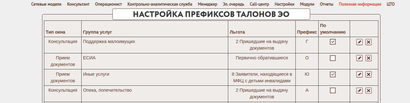 Префиксы талонов могут быть изменены в форме "Настройки->Настройки очереди и киоска->Префиксы талонов ЭО"