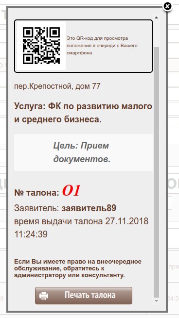 В случаях 1-2 заявителю выдается на руки талон (форма талона может редактироваться ответственным сотрудником МФЦ), где указаны № талона, МФЦ, услуга, дата и время записи. В случае 3 заявитель может распечатать талон сам. В случае 4 эти данные сообщаются ему по телефону.