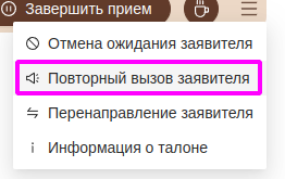 Если прием длится достаточно долго, то специалист может предложить заявителю подождать в зоне ожидания. Для повторного вызова заявителя служит кнопка "Повторный вызов заявителя".