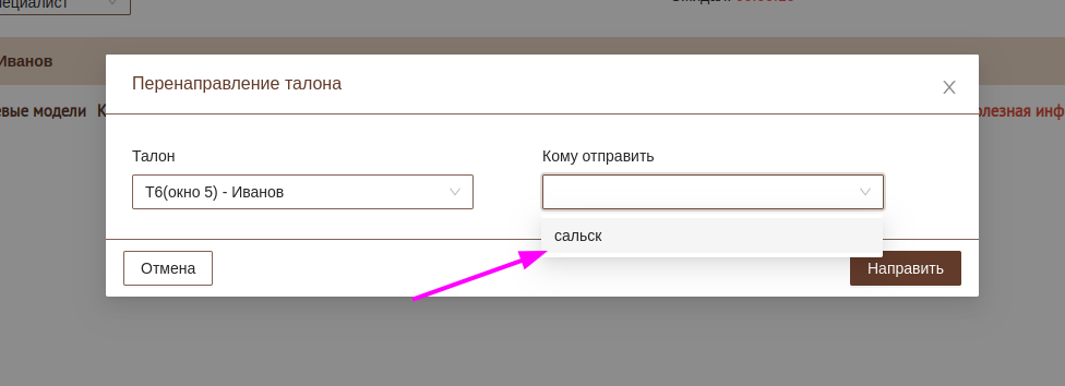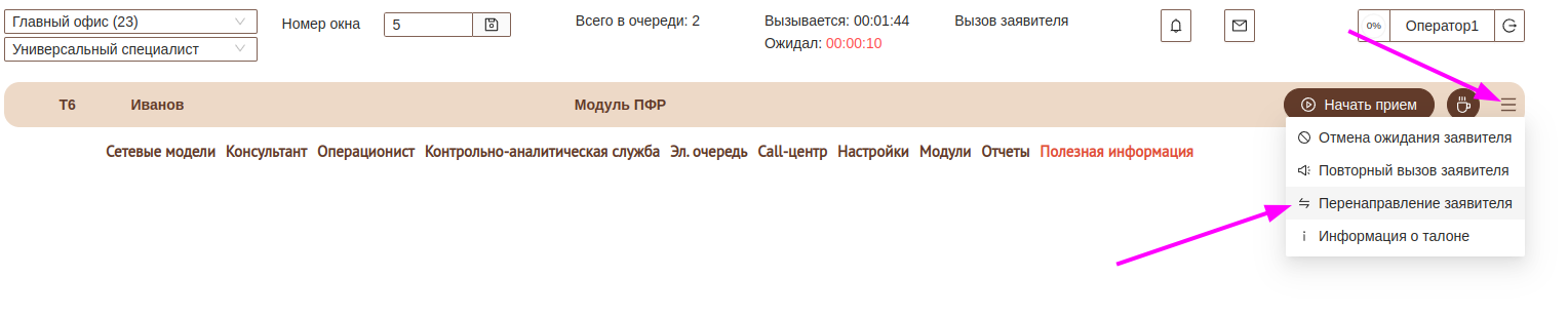 Оператор на приеме имеет возможность перенаправить заявителя к другому специалисту, для этого он должен нажать на панели управления очередью соответствующую кнопку