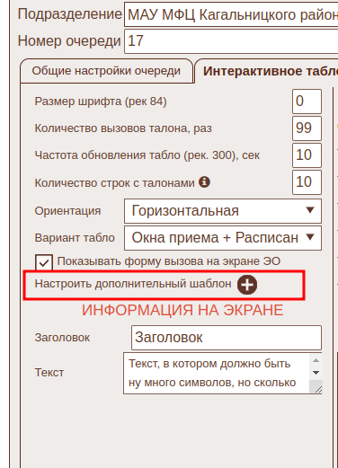 Данный виджет выводить текст из настройки "Информация на экране" настроек электроннной очереди