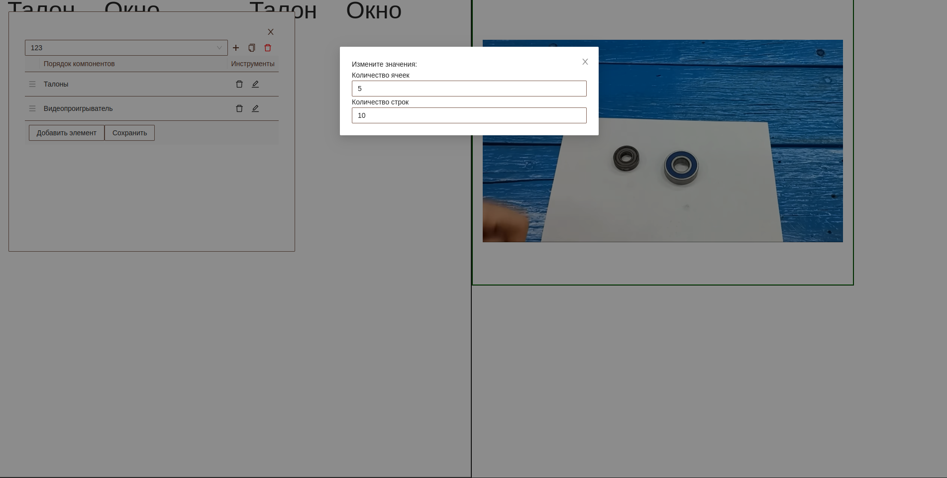 Данные настройки отвечают за то, сколько места будет занимать компонент на странице. Вся страница, условно, поделена на таблицу: 10х10 ячеек. И значениями в этих настройках мы указываем сколько конкретно ячеек будет отдано данному виджету. На данном экране у нас виджет "Талоны" занимает 10х10 ячеек. Давайте снизим количество занимаемых им ячеек до 5, а количество строк оставим неизменным. Значение в данных настройках не обязательно должны быть целым числом. Можно указать дробное число, например, 5.4. Только следите, чтобы там обязательно была точка между цифрами. После ввода нового значения в настройку мы сразу видим на заднем плане, как изменилась страница. И у нас сразу появился блок с видео(если оно настроено. Об этом будет позже отдельно про каждый виджет).
