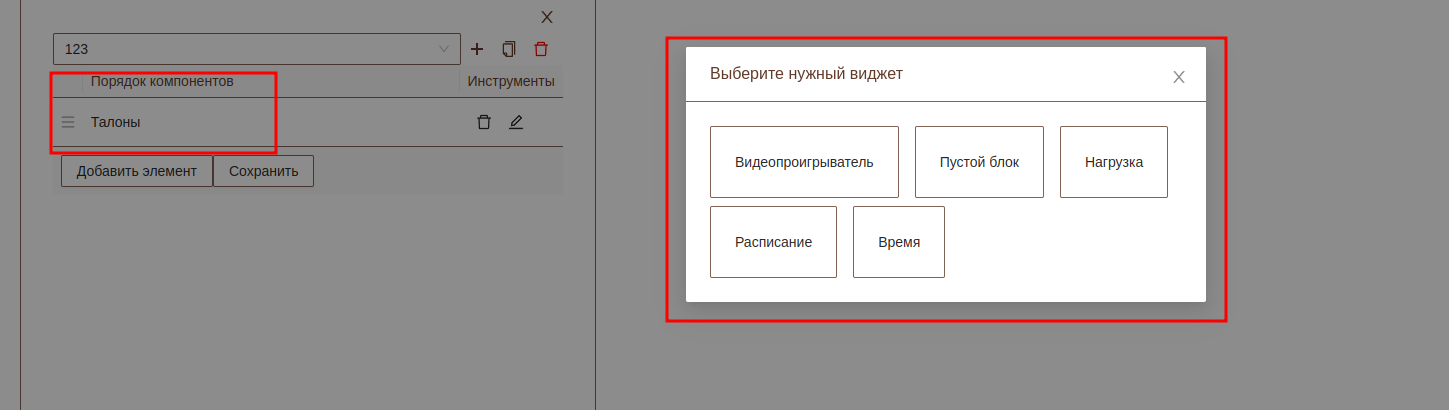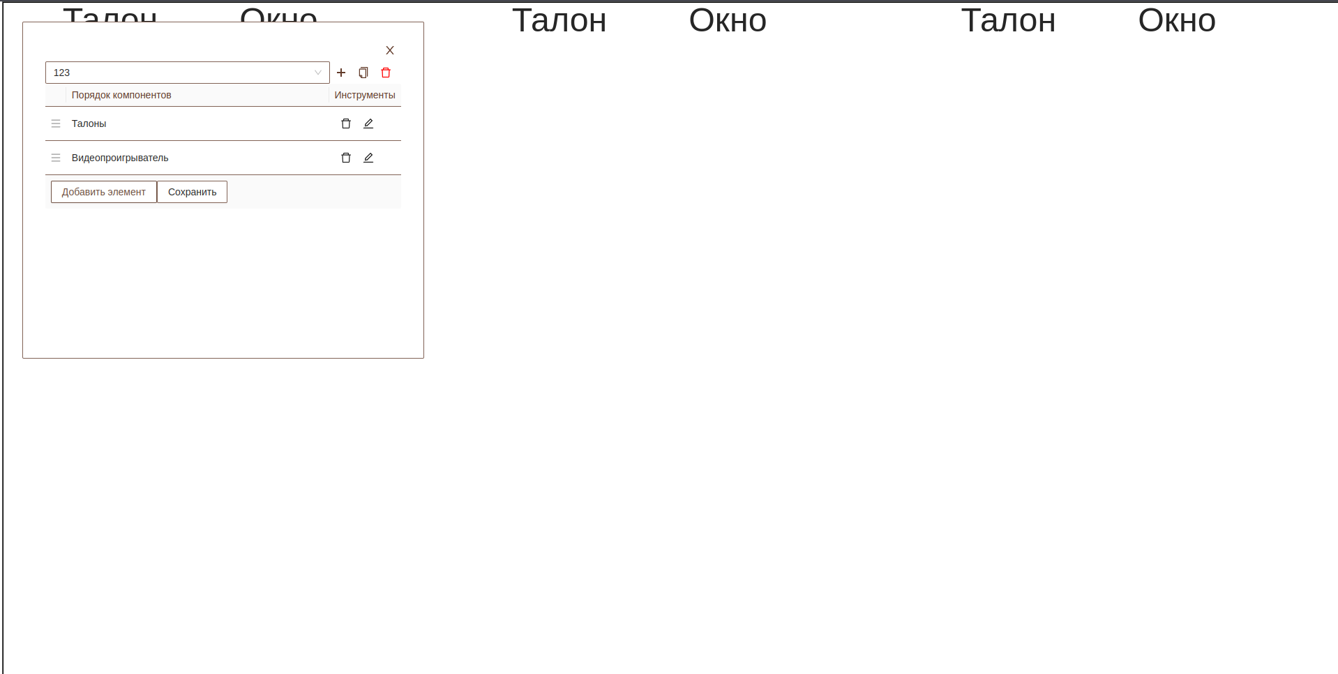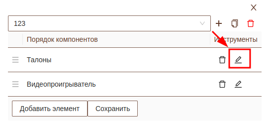 Мы можем увидеть, что видеопроигрыватель добавился на страницу, но мы его не видим. Все дело в том, что виджет "Талоны" занимает все место на экране. Для изменения параметров "Талонов" нажмем на кнопку редактирования в строке с компонентом "Талоны".