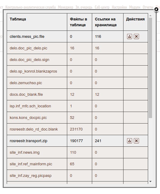 Здесь в первой колонке перечислены таблицы базы данных, в которых могут храниться данные, занимающие значительный объем. Во второй колонке указано количество файлов хранящихся внутри БД, в третьей - количество ссылок на файлы, хранящиеся в файловом хранилище. Четвертая колонка - действия, которые можно предпринять с этой таблицей : первая кнопка - перекачать файлы из БД в файловое хранилище, вторая - удалить из БД уже перекачанные файлы(автоматически они не удаляются). Если нажать на кнопку "Выгрузить в ФС" - начнется длительный процесс выгрузки. Файлы выгружаются пачками по 15 файлов, во время выгрузки цифра в колонке "Ссылки на хранилище" будет меняться, когда она сравняется с цифрой в колонке "Файлы в таблице" - процесс выгрузи данной таблица завершен. Возможность перекачать данные из БД в ФС есть не для всех таблиц - зависит от готовности компонентов программы работать с таким способом хранения, по мере проведения рефакторинга программы их количество будет увеличиваться.