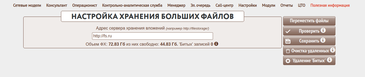 Форма настройки взаимодействия с сервером хранения файлов доступна в пункте меню "Настройки->настройки->Хранение вложений.