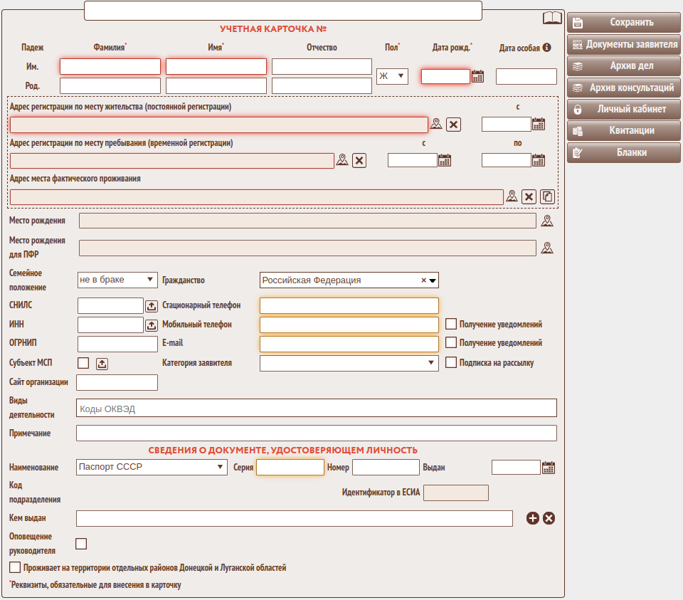 Все остальные реквизиты так же желательно ввести, так как они необходимы для электронного документооборота и переноса информации из карточки Заявителя в реквизиты его документов, что значительно ускоряет работу с делом.
