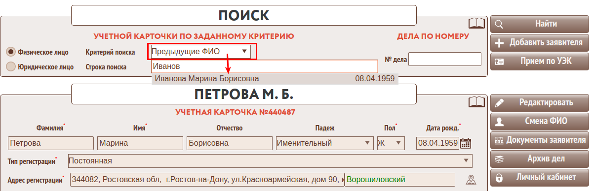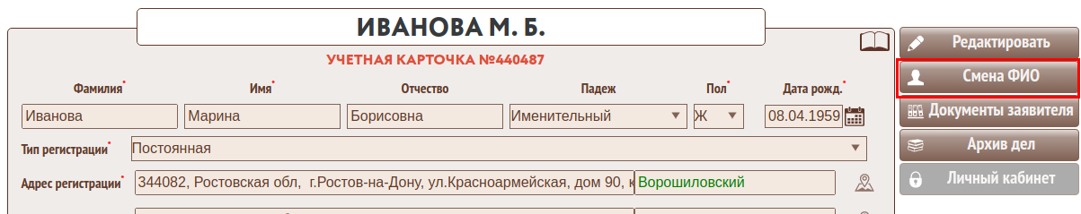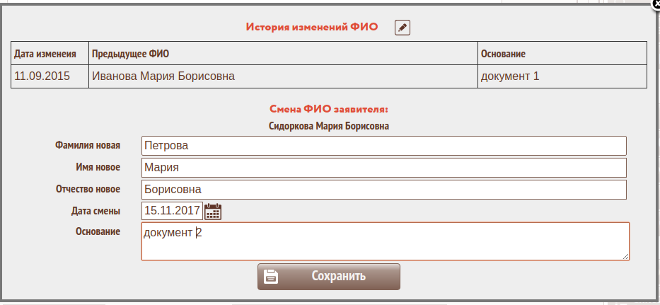 При необходимости исправить ошибки или ввести полную историю изменений фамилии заявителя можно редактировать "Историю изменений ФИО". На текущее состояние карточки эта форма влияния не оказывает.