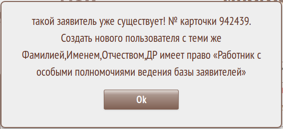 Фамилия, имя, отчество и дата рождения являются строго обязательными реквизитами, позволяющими идентифицировать личность. Они должны быть уникальными и ввод заявителей с одинаковыми Фамилией, именем, отчеством и датой рождения заблокирован. Однако возможно, что такие заявители все-таки существуют. Их ввод разрешен для "Работник с особыми полномочиями ведения базы заявителей", которые указывается в настройке.