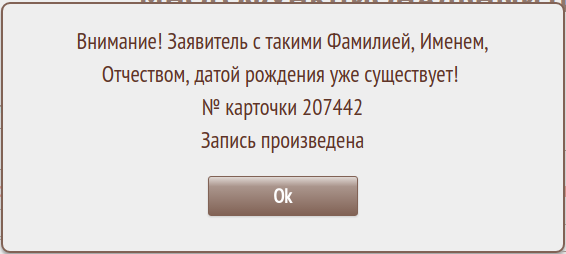 При попытке ввести заявителя с одинаковыми Фамилией, именем, отчеством и датой рождения для обычного пользователя: