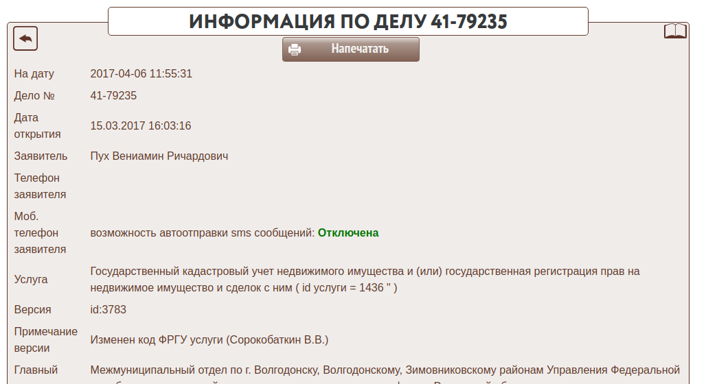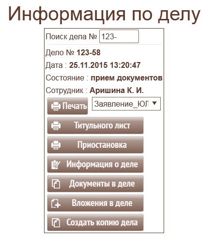 Указав номер дела, можно получить информацию о состоянии дела, напечатать все сопроводительные документы по делу (заявления,квитанции,титульный лист), получить информацию по какой услуге, в каком отделении МФЦ, когда и кем открыто дело, кто работал с этим делом, какие документы имеются в деле.