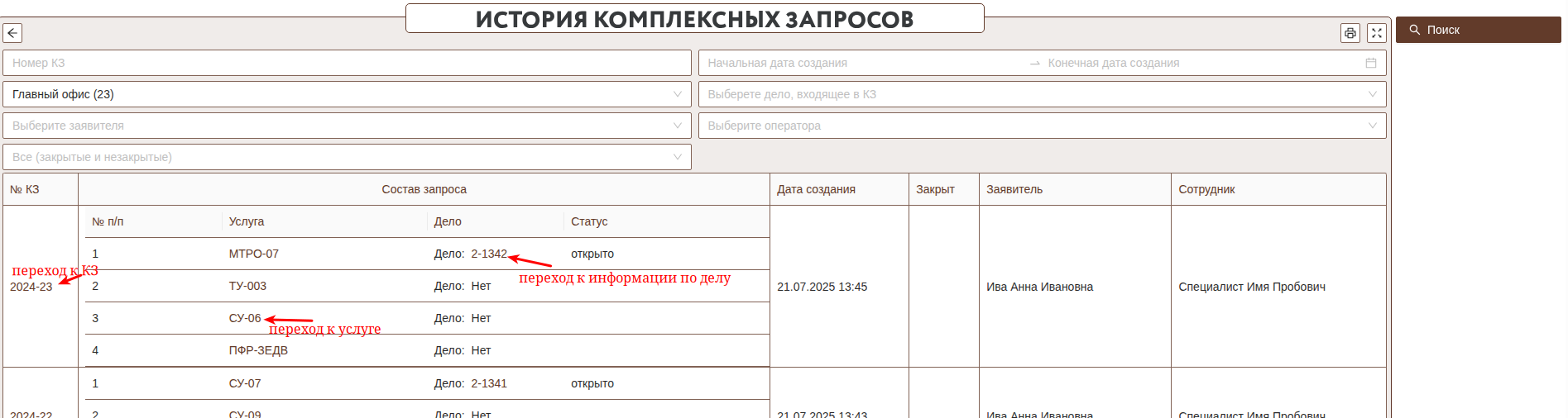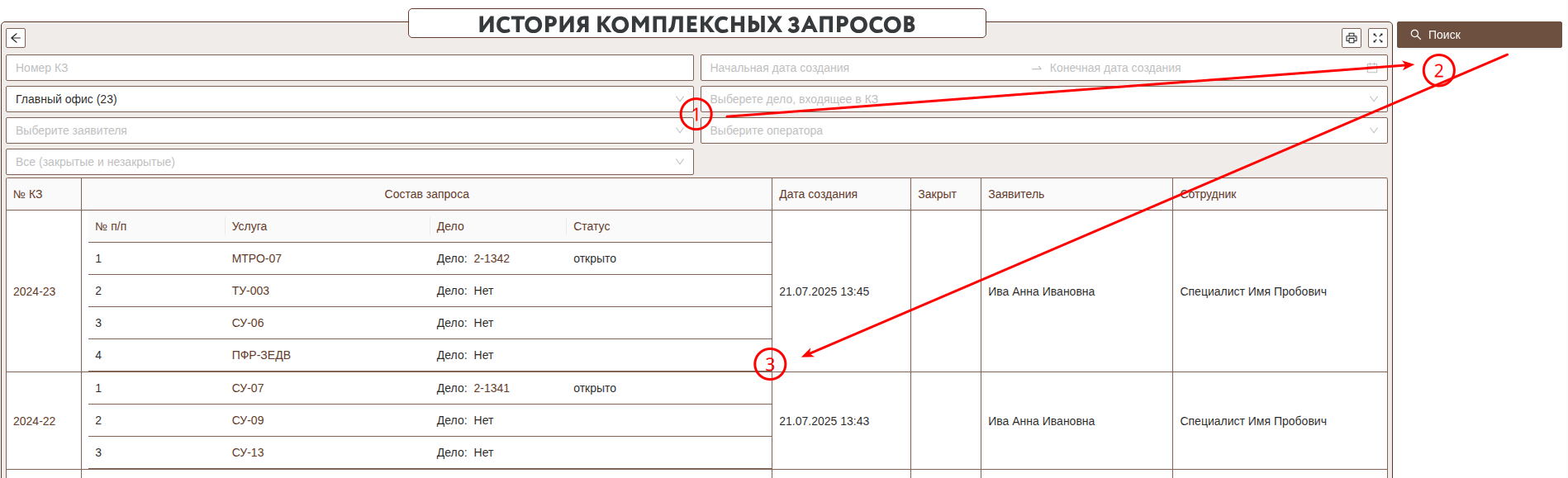 После ввода фильтра и нажатия "Поиск" выводится информация о подходящих КЗ.