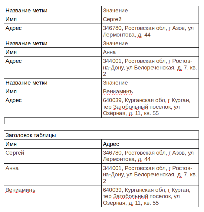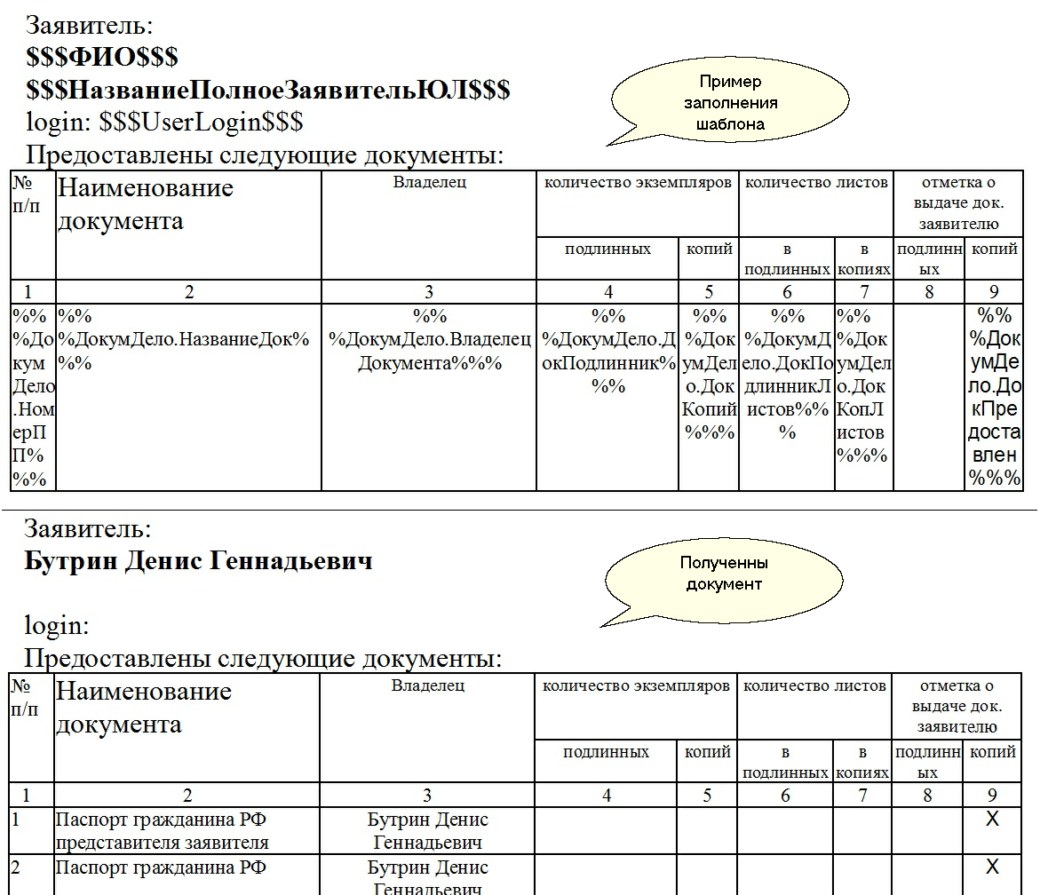 При печати документа все метки из шаблона заменяются на данные и в результате специалист получает готовый документ. Ниже приведен пример заполнения обычных и табличных меток.