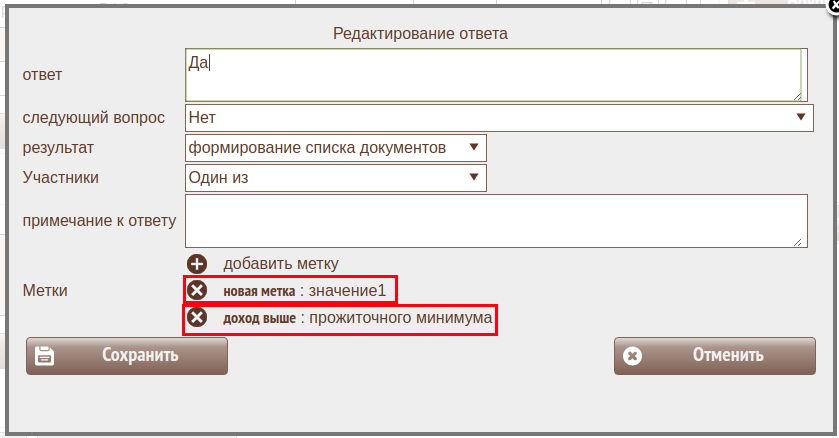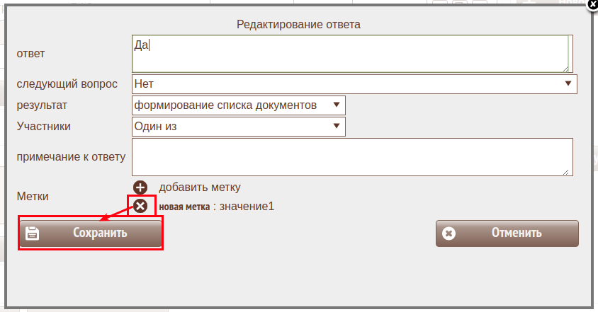 При необходимости метки могут быть удалены с ответа. Для этого отмените название метки и зафиксируйте значение