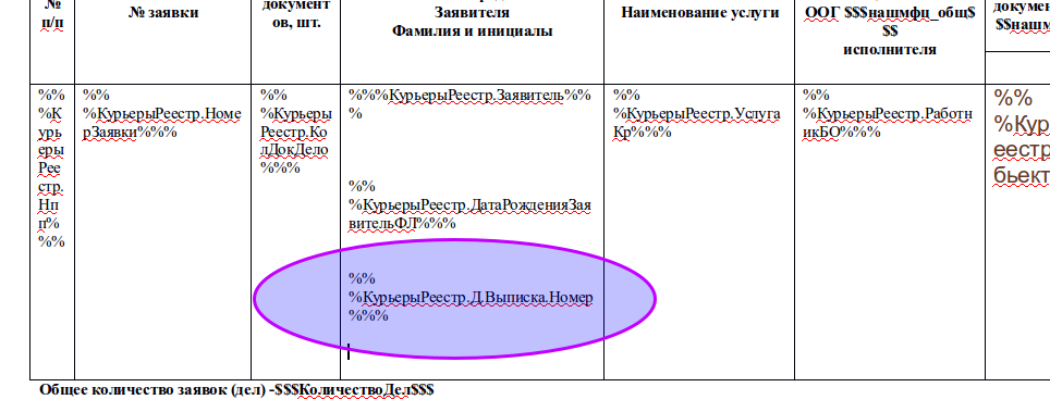 Также есть возможность использовать метки вида Д.название_документа.название_реквизита в таблицах шаблонов не относящихся к какому-то одному делу. Например в реестре дел для курьеров. В таком случае метка будет иметь вид %%%Название_категории_меток.Д.название_документа.название_реквизита%%%, где Название_категории_меток - это основной префикс меток для выбранного шаблона (например для реестра курьеров - это КурьерыРеестр). Значение метки будет заполнено из реквизита документа, прикрепленного к делу, в отношении которого сформировалась строка табличной части шаблона, и владельцем которого является основной заявитель по делу.