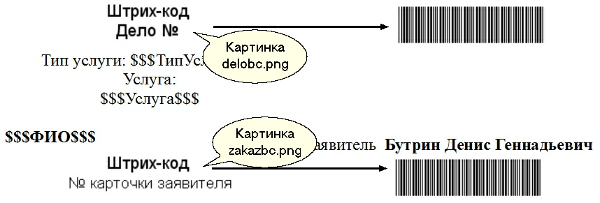 В программе предусмотрена возможность печати штрих-кода номера дела и номера учетной карточки заявителя. Для их печати нужно вставить в документ (на месте, где нужна печать штрих-кода) соответствующие изображения, которые находятся в папке www/blank/. Или же в интерфейсе программы перейти в пункт меню Настройки->Управление бланками печати документов->Настройка QR кодов и сказать файл с изображением для замены. Файл delobc.png печатает штрих-код дела, zakazbc.png печатает штрих-код заявителя.